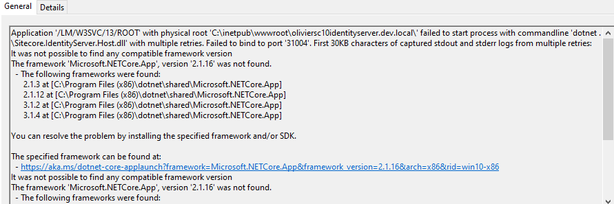 J’ai installé de nombreuses versions de Sitecore sur mon ordinateur. À l’heure actuelle, j’ai 9.0.1, 9.3 et 10.0 en cours d’exécution simultanément. Ce que l’erreur indique, c’est que j’ai besoin d’une version spécifique de Microsoft.NETCore.App (2.1.16) qui n’a manifestement pas été installée par SIA lorsque j’ai installé Sitecore 10.0.