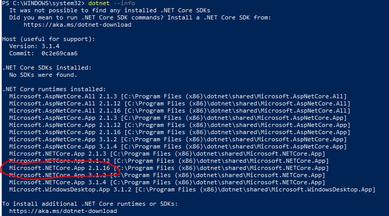 Je peux vérifier que je n’ai pas le runtime pour Microsoft.NETCore.App 2.1.16