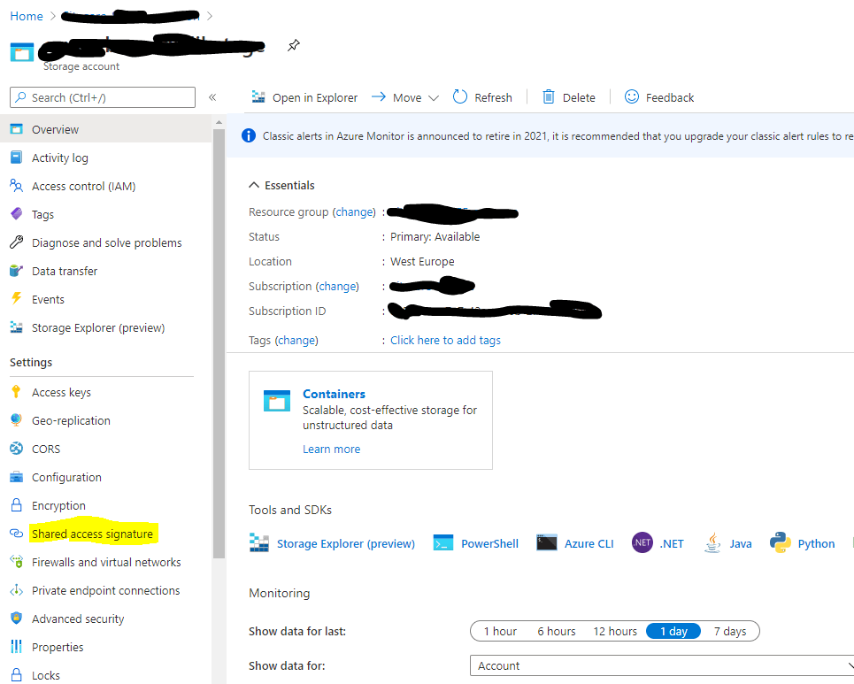 In Azure portal, identify and open your Storage Account. In the left handside menu, click on “Shared access signature”