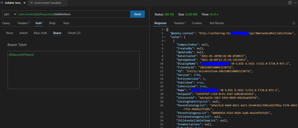 Let’s now test some API that we just imported from Sitecore. Let’s begin with listing all the SellableItems (request in CatalogAPISamples/Catalog – API/Sellable Items). Open it and click on Send.