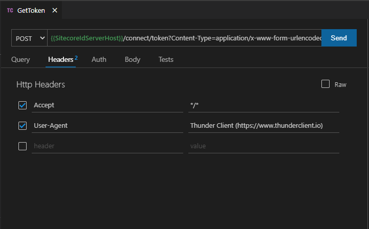 Looking in the headers, we see that we try to create a header called “Authorization” with the variable {{SitecoreIdToken}}. As it works in Postman, the way to authorize a request in Thunder Client is to use the “Auth” tab. We need to write this SitecoreIdToken in the Bearer tab of Auth.
