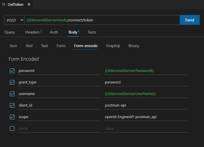 Now when you do a GetToken request, the resulting token is saved in the variable SitecoreIdToken.