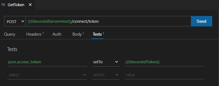 In order to save this token to the environment variable SitecoreIdToken, click on the tab called “Tests” and add
